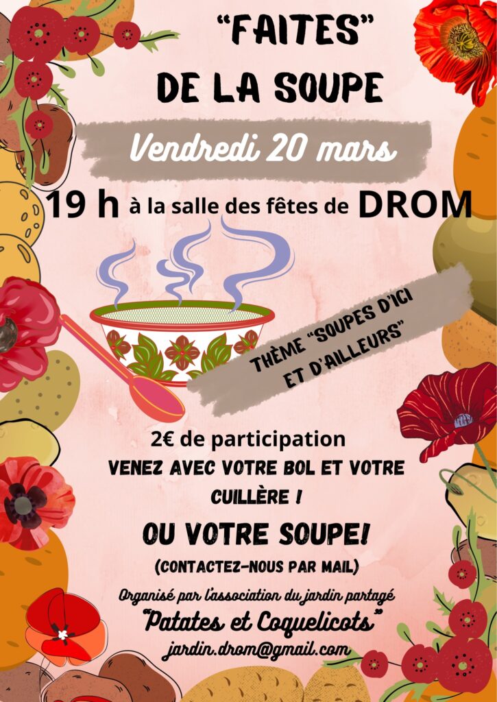 Bientôt à Drom . . . Publication publiée :16 mars 2026 Commentaires de la publication :0 commentaire Encore des animations pour étrenner la nouvelle salle : gastronomie, convivialité, culture ! Pour les soupiers et les soupeurs Entrée libre Étiquettes: DROMothèque, Faites de la Soupe, Fête du court métrage, Patates & Coquelicots Read more articles Article précédentDes court métrages à la DROMothèque Laisser un commentaire Annuler la réponseCommentEnter your name or username to comment Enter your email address to comment Saisir l’URL de votre site (facultatif) Are you human? Please solve: